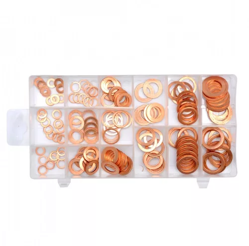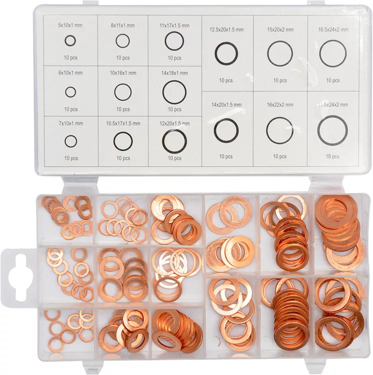 Réz alátétkészlet műhelyhasználatra. Csomag tartalma: 10 db: 5x10x1; 10 db: 8x11x1; 10 db: 11x17x1,5; 10 db: 12,5x20x1,5; 10 db: 15x20x2; 10 db: 16,5x24x2; 10 db: 6x10x1; 10 db: 10x16x1; 10db: 14x18x1; 10 db: 7x10x1; 10 db: 10,5x17x1,5; 10 db: 12x20x1,5; 10 db: 14x20x1,5; 10 db: 16x22x2; 10 db: 17,5x24x2. Minden egy praktikus műanyag dobozba van csomagolva, rekeszekkel, amelyek biztosítják betétméretek helyes elkülönítését.