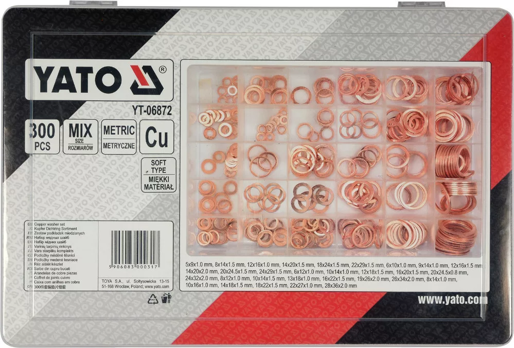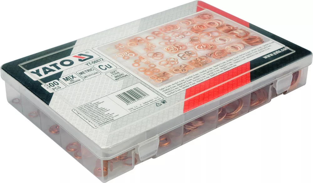 300 db puha réz alátét készlet. A készlet 5x9x1 mm-től 28x36x2 mm-ig. Az egész egy praktikus tárolóban.