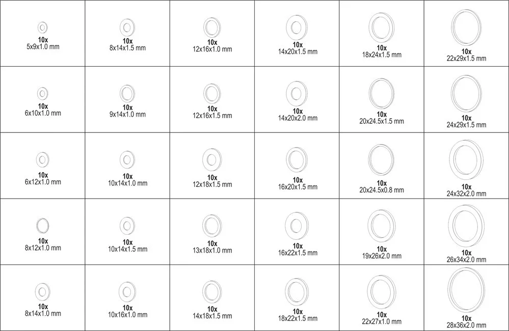Alátétek x300 (Ø5x9x1 mm x10, Ø6x10x1 mm x10, Ø6x12x1 mm x10, Ø8x12x1 mm x10, Ø8x14x1 mm x10, Ø8x14x1,5 mm x10, Ø8x14x1,5 mm x10, Ø1x01 x10, Ø9x1, 4x1 mm 1 0x14x1,5 mm x10, Ø10x16x1 mm x10, Ø12x16x1