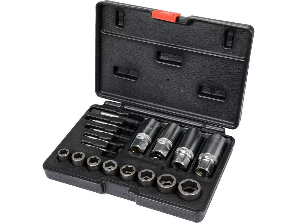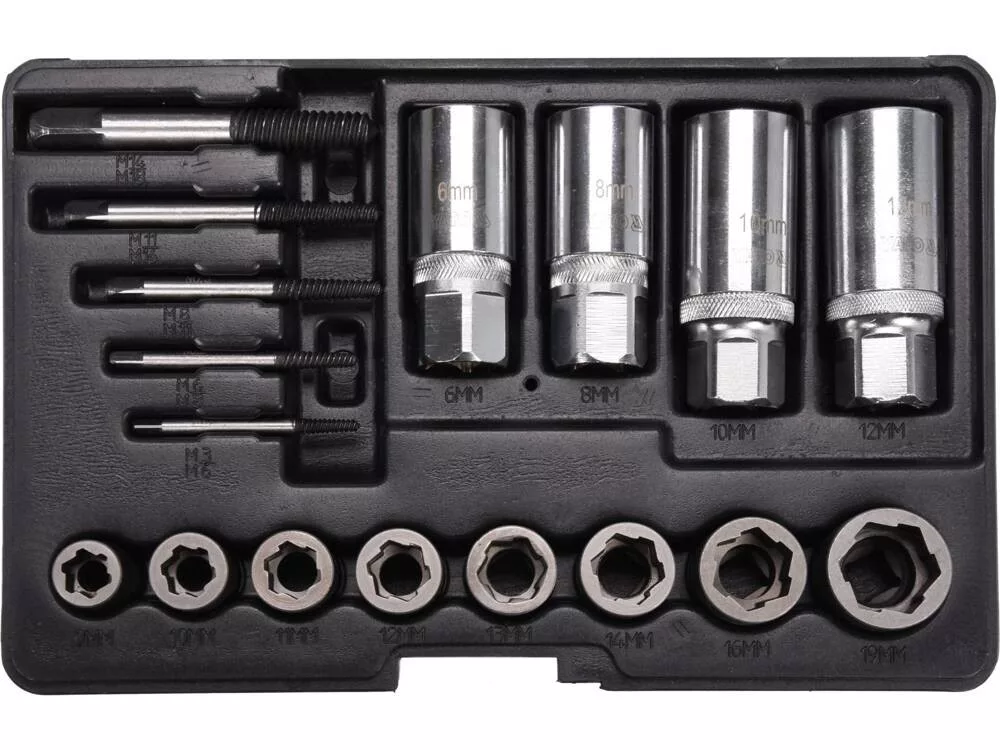 Univerzális, 17 darabos elszívókészlet csavarok és foglalatok kicsavarásához. Gépészeti és autóipari szervizekhez ajánlott.