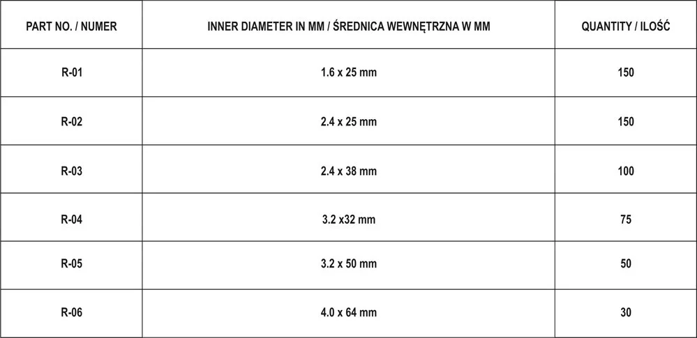x555 (1,6 x 25 mm x 150, 2,4 x 25 mm x 150, 2,4 x 38 mm x 100, 3,2 x 32 mm x 75, 3,2 x 50 mm x 50, 4 x 64 mm x 30)