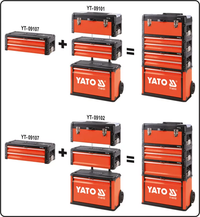 Ezenkívül a modul kényelmes, csúszásmentes fogantyúval, oldalsó fogantyúkkal rendelkezik a könnyű emeléshez és csúszásmentes alsó sarkokkal. A YATO szerszámtálcák kész szerszámkészlettel helyezhetők el a fiókokban.