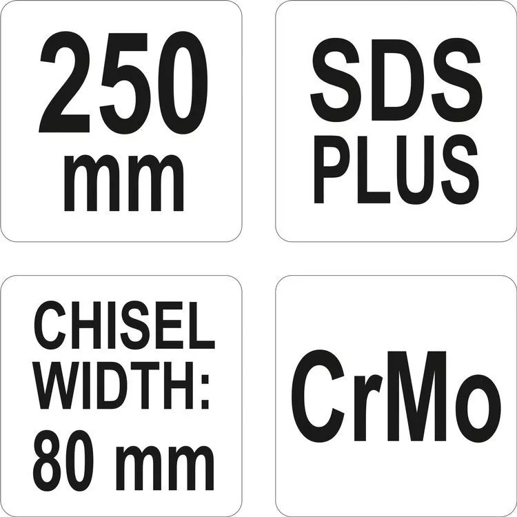 Széles vésőszár 80 x 250 mm-es, SDS-Plus, kiváló minőségű CrMo acélból.