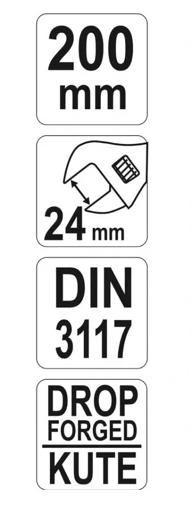 Állítható villáskulcs 0-24 / 200 mm-es, kovácsolt króm-vanádium acélból.