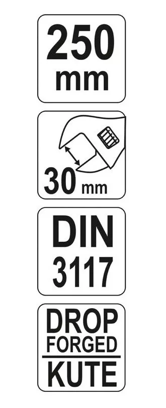 250 mm- es állítható villáskulcs, kovácsolt króm-vanádium acélból.