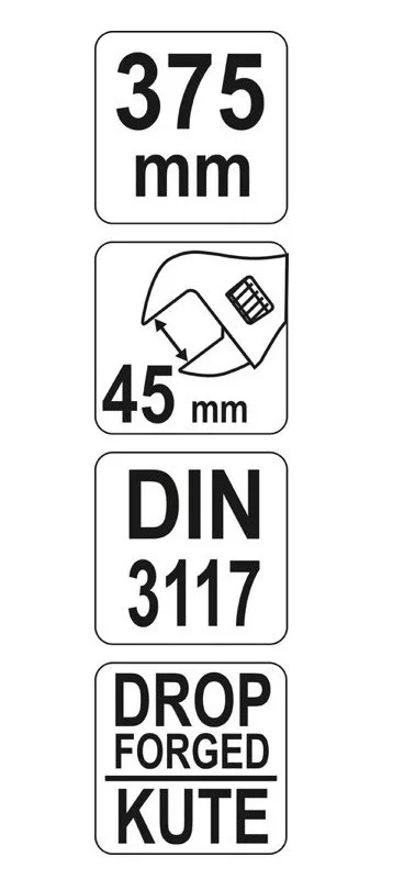 Állítható villáskulcs 0-49 / 375 mm-es, kovácsolt króm-vanádium acélból.