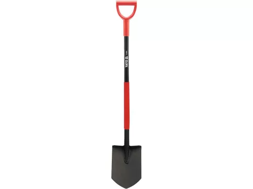 Egy kiváló minőségű ásó, ergonomikus, gumírozott bevonattal ellátott fém nyéllel és "D" profilú markolattal