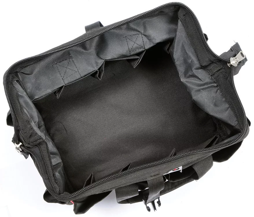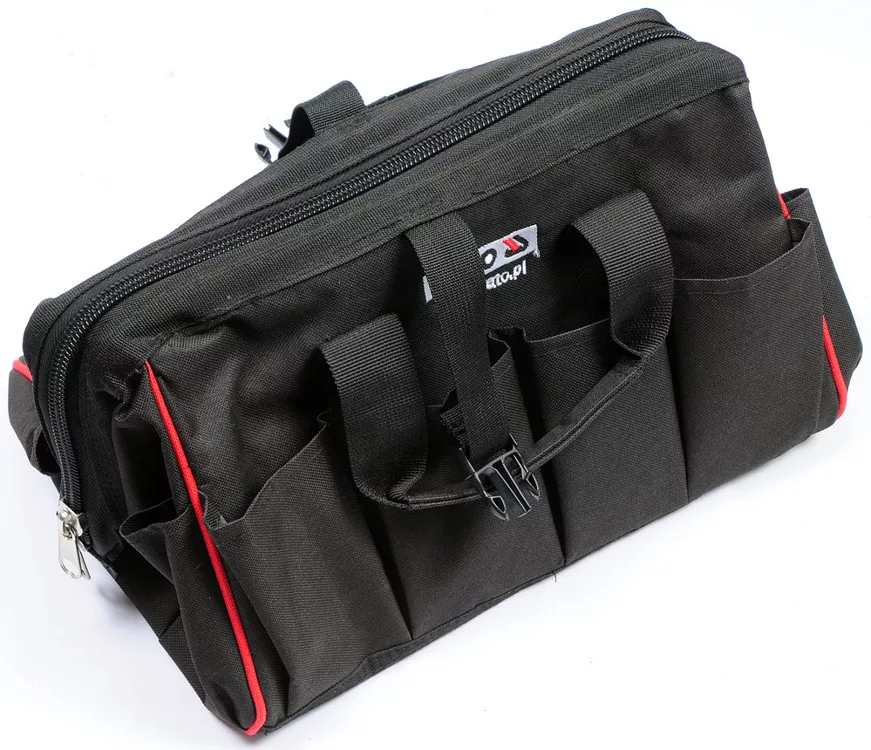 Masszív táska megerősített szerkezettel. Több szerszám szállítására tervezték. Nagy zsebekkel rendelkezik a kisebb szerszámok kényelmes tárolására, cipzárral zárva.
