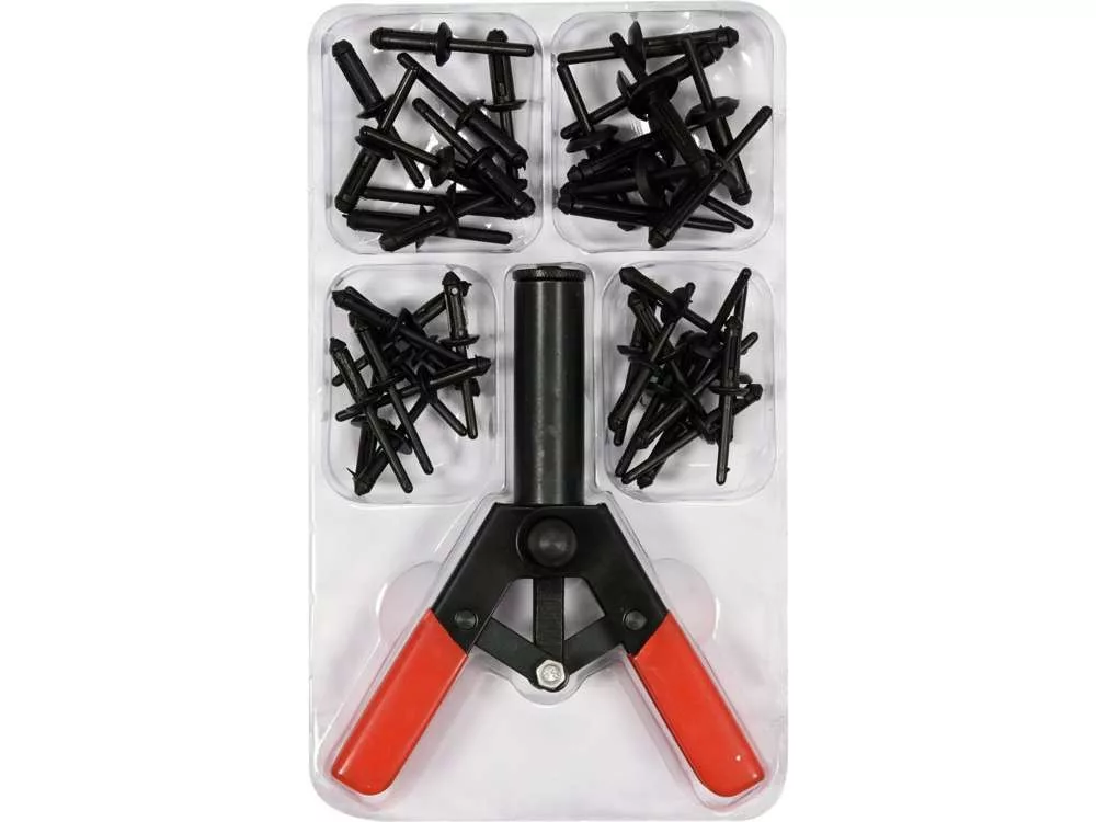 Tartalom: szegecselő, műanyag szegecsek x40 (5x15,8 mm x10, 5x17,2 mm x10, 6,3x25,2 mm x10, 6,6x17,2 mm x10)