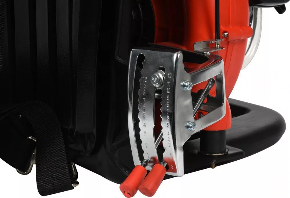 Benzines háti permetező 41,5 cm3, legtöbb alkatrésze könnyű alumíniumötvözetből és műanyagból készült.