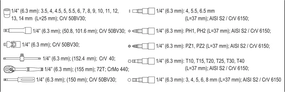 Dugókulcs készlet 38 részes 1/4" 3,5-14 mm-es, As-Drive rendszerrel, tartós króm-vanádium szerszámacélból.
