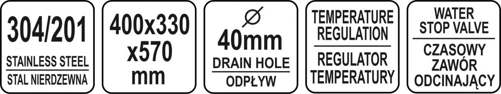A YATO térdmosdó kiváló minőségű rozsdamentes acélból készült. A készlet tartalmaz még egy oldalsó kifolyót, egy szappanadagolót és egy szelep- és tömlőkészletet, amelyek a mosdó felszereléséhez és a vízellátó hálózathoz való csatlakoztatásához szükségesek. A szett a térdre vezérelhető időszelepen kívül egy keverőt is tartalmaz szabályozással, amely lehetővé teszi a víz hőmérsékletének beállítását.