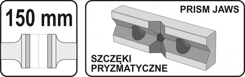 Cserélhető pofák prizmával, edzett acélból, lehetővé teszik csövek, rudak és kerek elemek rögzítését