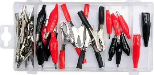 A csomag tartalma 28 db különböző méretű, szigetelt és nem szigetelt krokodilcsipesz.