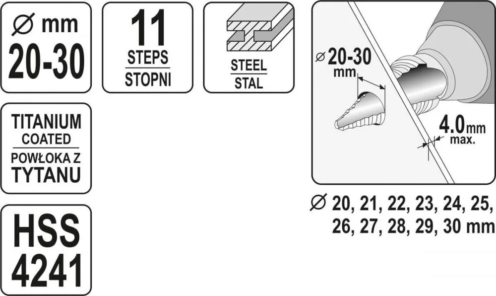 Yato lépcsős fúró 11 lépcsős 20-30 mm HSS-TiN