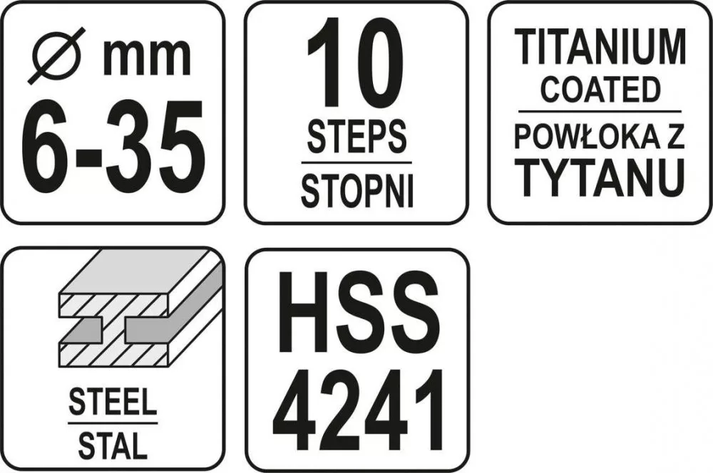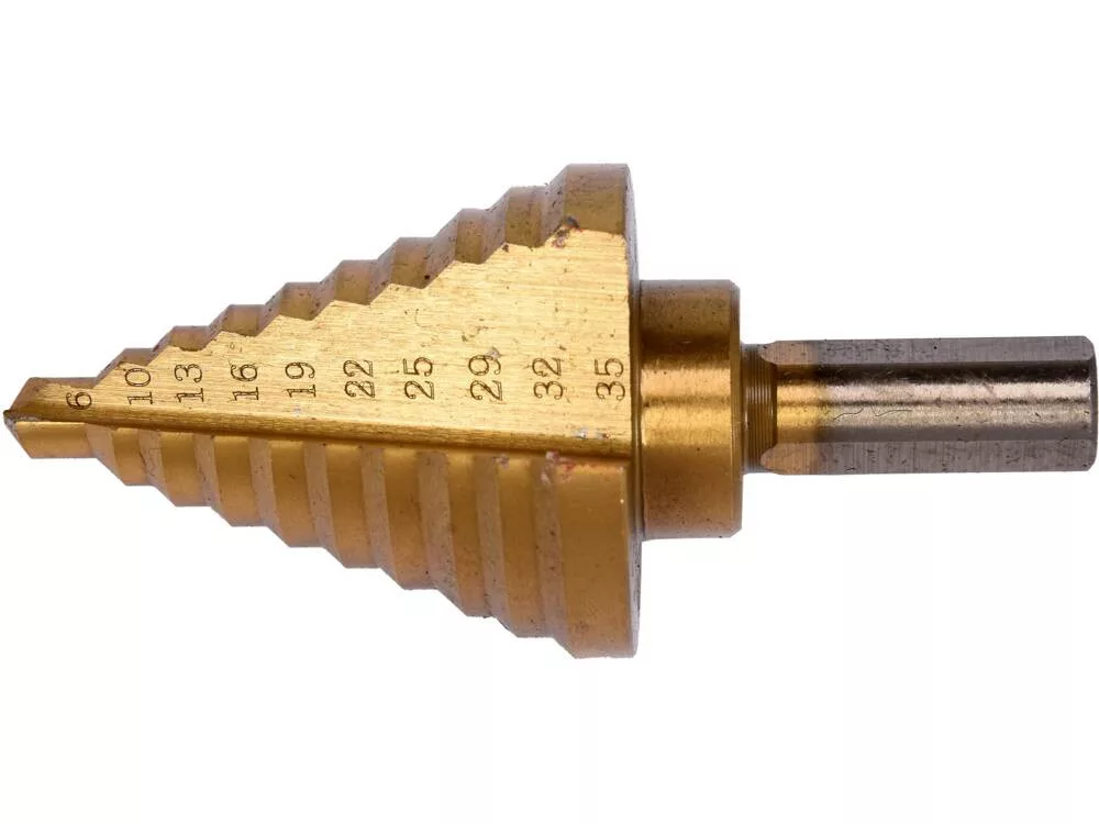 Lépcsős fúró 6-35 mm-es, 10 lépcsős, HSS 4241 gyorsacélból, titán-nitriddel bevonva a fúró tartósságának növelése érdekében, ideális szerszám lemez megmunkálásához.