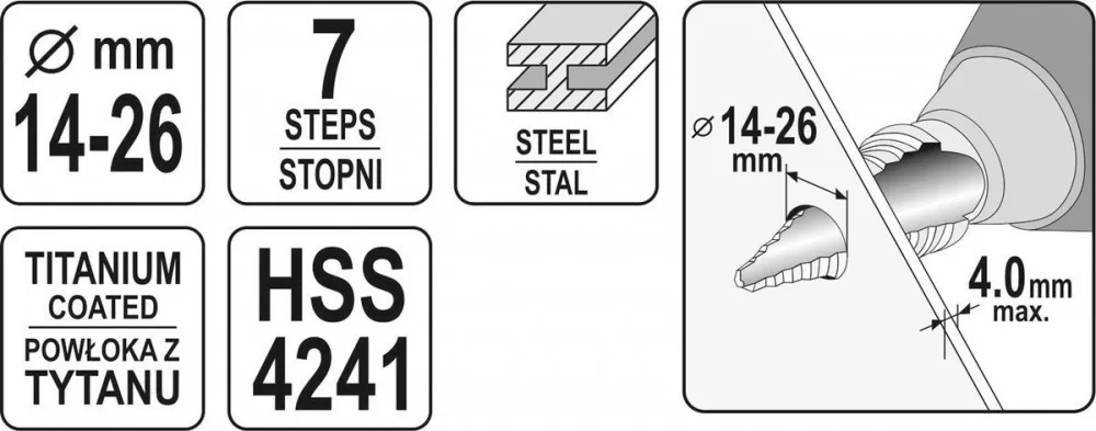 Lépcsős fúró 14-26 mm-es, 7 lépcsős, HSS 4241 gyorsacélból, titán-nitriddel bevonva a fúró tartósságának növelése érdekében, ideális szerszám lemez megmunkálásához.