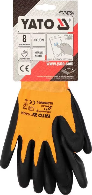 Narancssárga nylonból készült védőkesztyű sűrű öltéssel, a tenyérben fekete habosított nitrillel bevonva, speciális adalékanyaggal, amely lehetővé teszi az érintőképernyők zökkenőmentes működését olyan eszközökben, mint például okostelefonok vagy táblagépek.