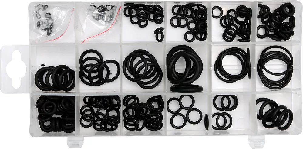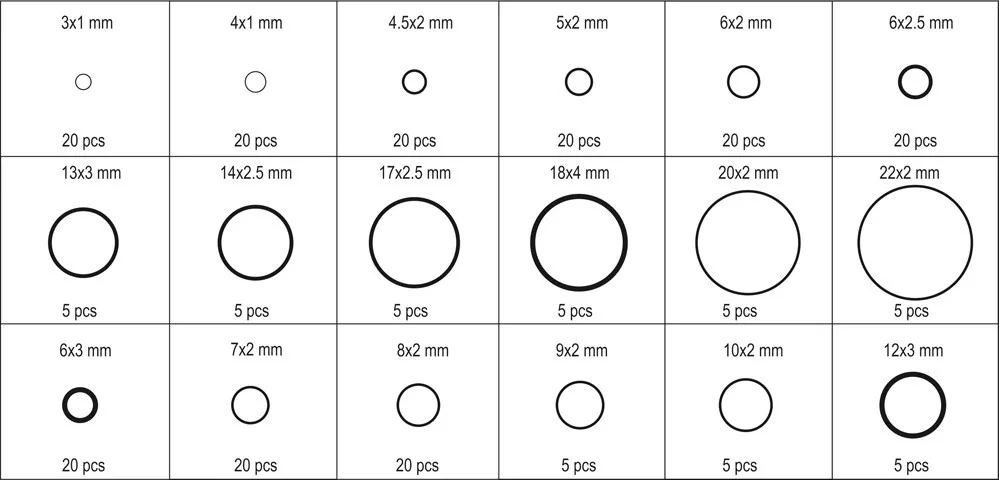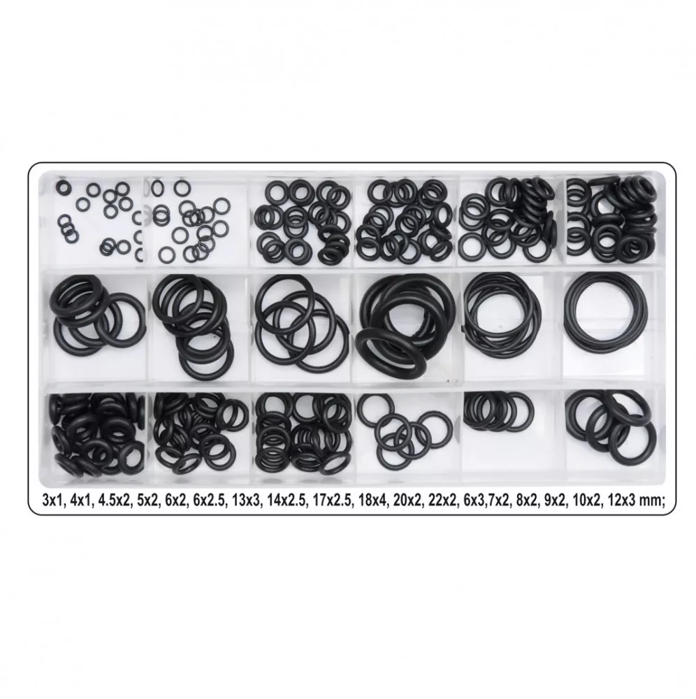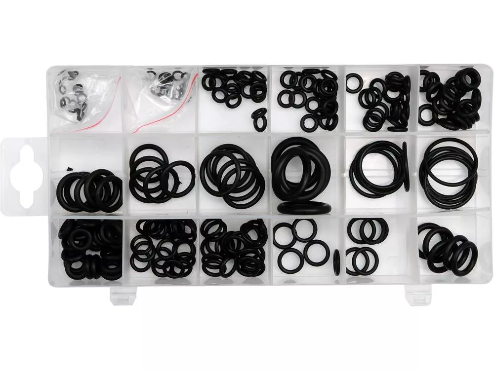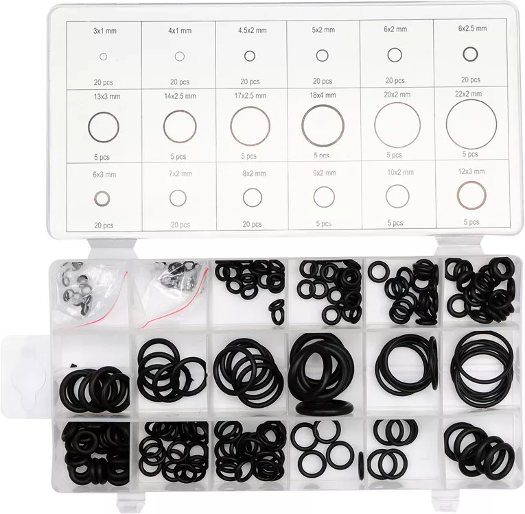 Praktikus készlet 225 gumi O-gyűrűből. 18 különböző méretet tartalmaz. Az O-gyűrűk gumiból készülnek, amely ellenáll az agresszív tényezőknek, mint például az üzemanyagok, olajok, vegyszerek és a magas hőmérséklet.