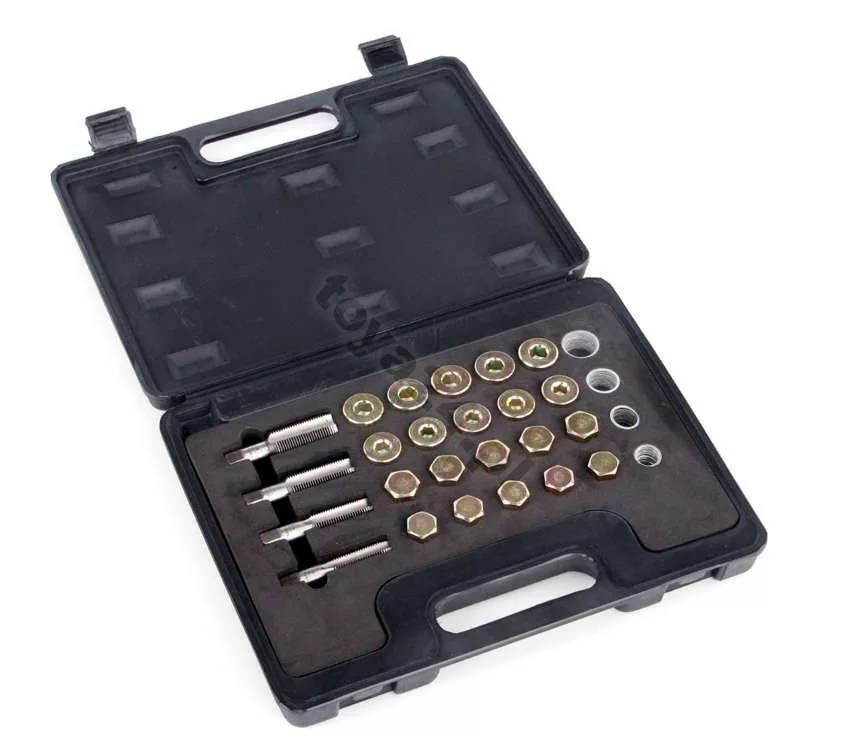 Olajleeresztő csavar menetjavító készlet 64 részes, gépészeti, lakatos és autóipari szolgáltatásokhoz használható készlet.