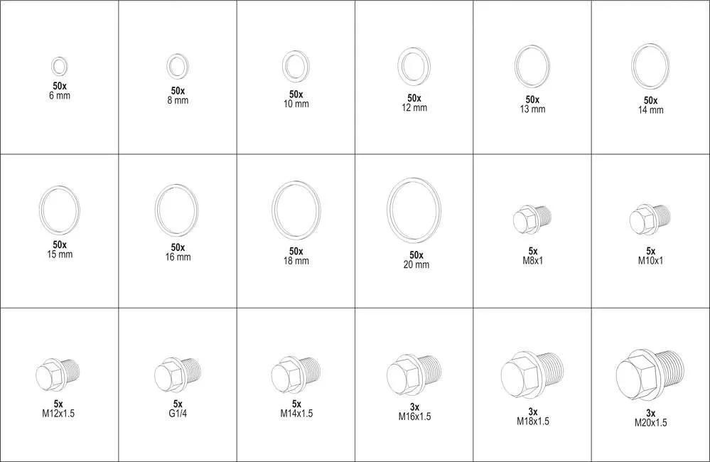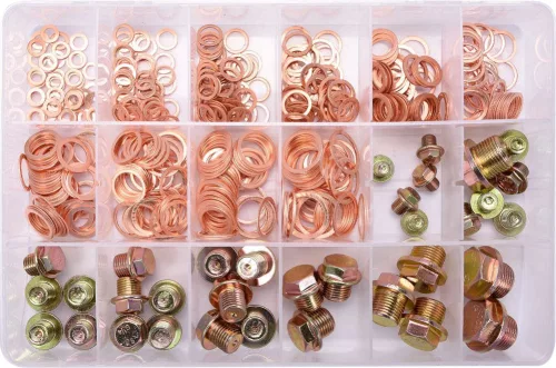 534 db-os réz alátétből és olajleeresztő csavarból álló készlet. A készlet 6-20 mm-es méreteket tartalmaz. Az egész egy praktikus "válogató" típusú tárólóban került.