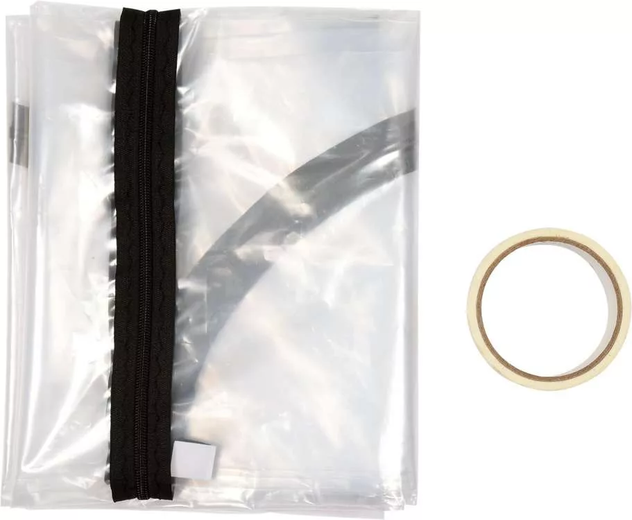 A nyitható rész U-alakú, bevarrt cipzárral nyílik, egyetlen csúszkával. A fóliát ragasztószalaggal rögzítjük.