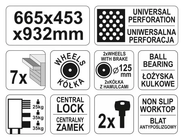 Professzionális műhelyszekrény 7 fiókkal: 5 keskeny, egy közepes és egy nagy. Minden fiók központi zárral. A szekrény fékkel ellátott forgó kerekekkel rendelkezik, amelyek lehetővé teszik a szekrény kényelmes mozgatását.
