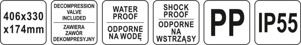 Rugalmas polipropilénből készült, IP55 ellenállási osztálynak megfelelően. Hatékony tömítőrendszer jellemzi, dekompressziós szeleppel gazdagítva, amely a légi szállítás során a nyomás kiegyenlítésére szolgál.