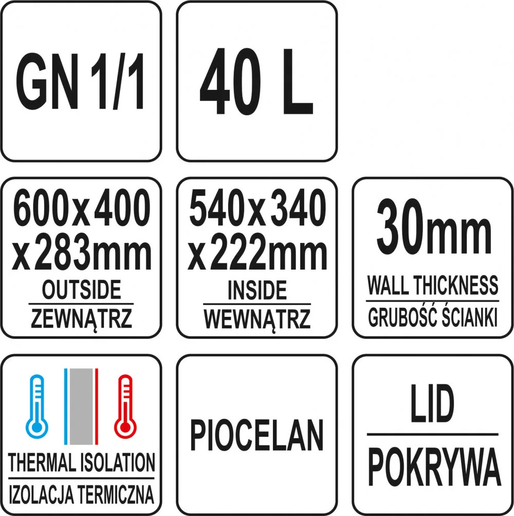 Űrtartalom: 40 liter Magas kopás- és ütésállóság, valamint vegyszerállóság jellemzi. Ezenkívül nagyon könnyű tisztán tartani, mivel mosogatógépben mosható. A tartály külső méretei 600x400x283mm, falvastagsága 30mm, űrtartalma 40l. A belső méretek 540x340x222mm és lehetővé teszik a GN konténerek szállítását. A kis súly és az ergonomikus oldalfogantyúk megkönnyítik a szállítást. Az alsó és a fedél speciális szerkezete lehetővé teszi az egymásra rakást.