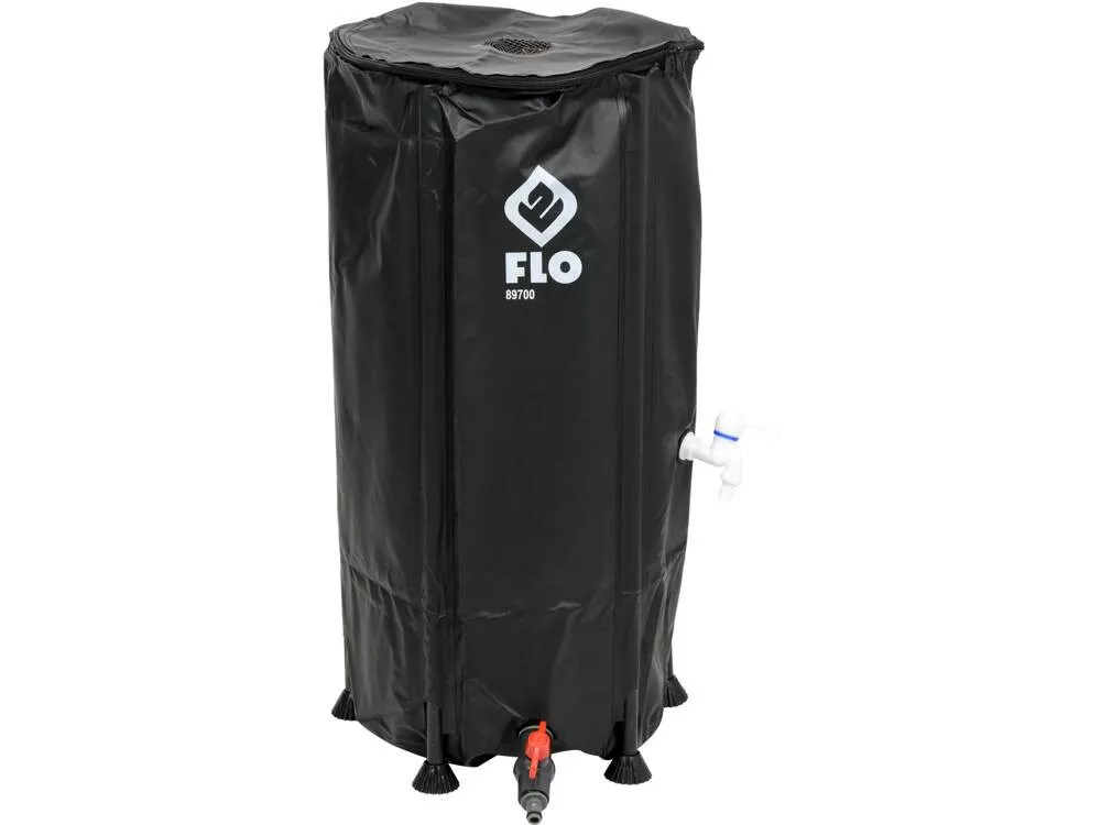 Összecsukható, rugalmas esővíztartály beépített szűrővel és túlfolyószeleppel.