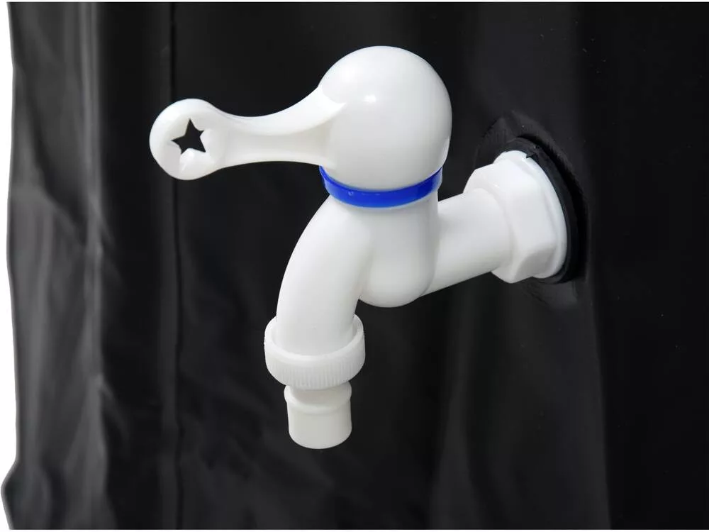 Összecsukható, rugalmas esővíztartály beépített szűrővel és túlfolyószeleppel.