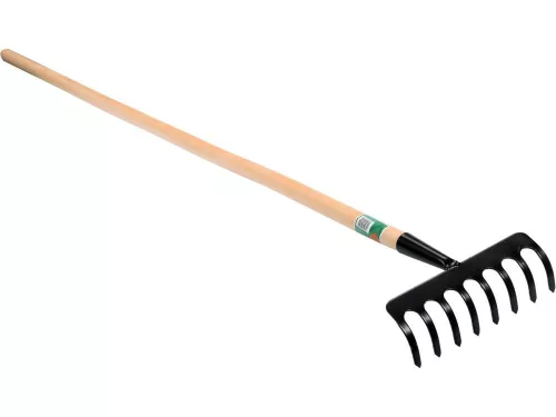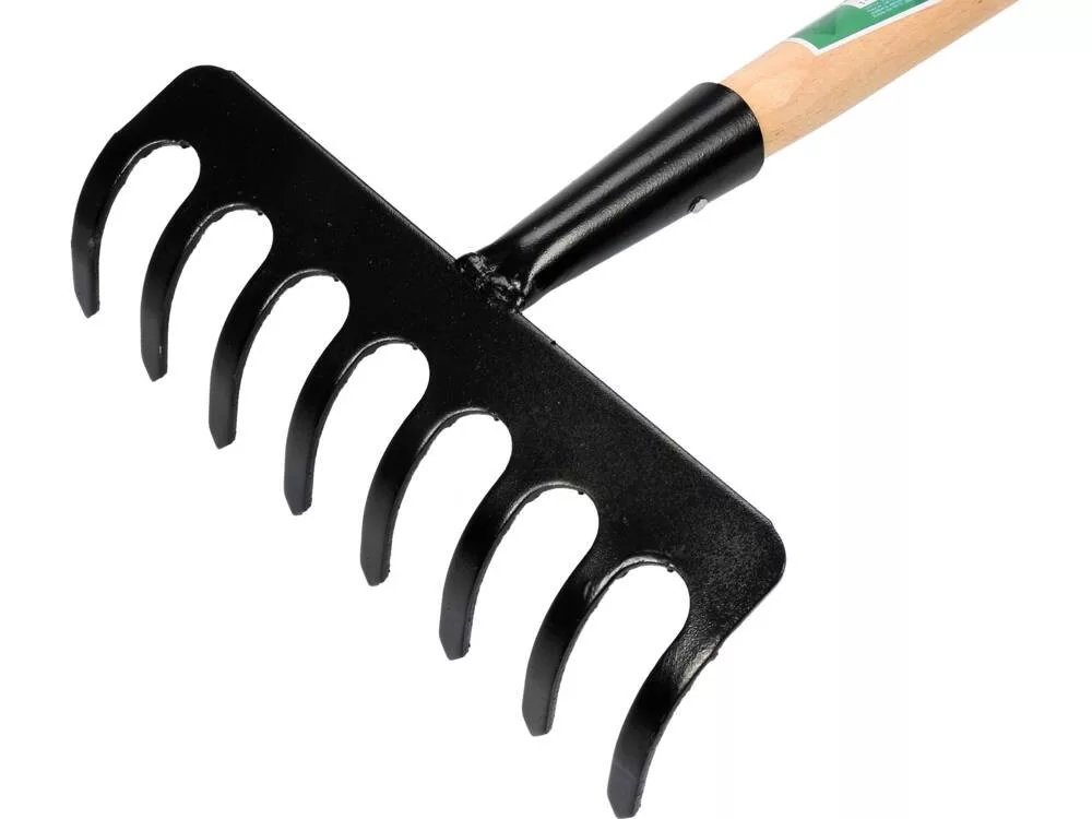 Gereblye, 8 foggal, fémből készült, fa nyéllel.