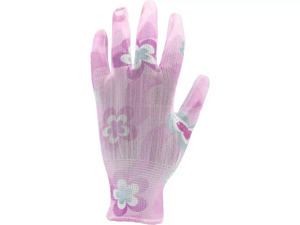 Flo kertészkesztyű rózsaszín virágmintával 8-as, PU bevonattal.