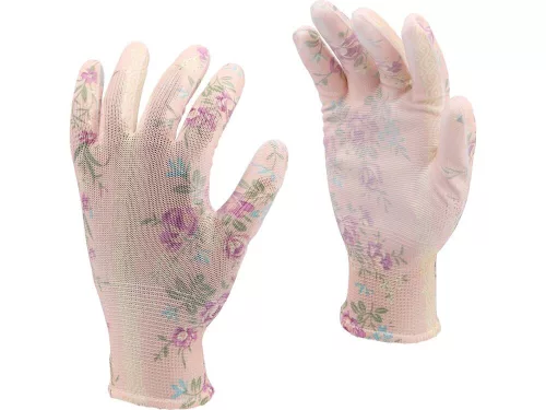 Flo kertészkesztyű rózsaszín virágmintával 9-as, PU bevonattal.
