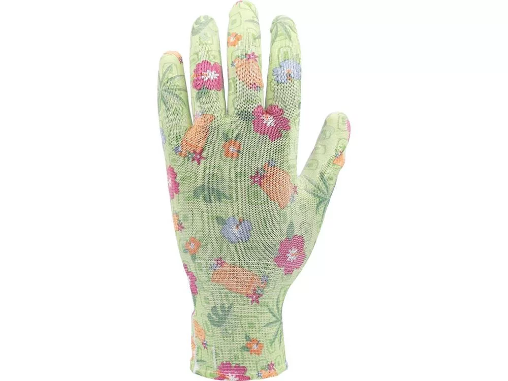 Flo Kertészkesztyű zöld virágmintával 10-es, PU bevonattal.