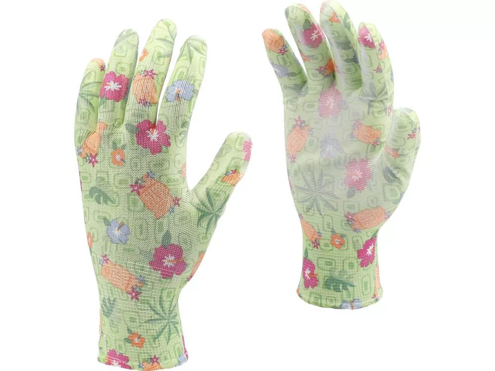 Flo kertészkesztyű zöld virágmintával 8-as, PU bevonattal.