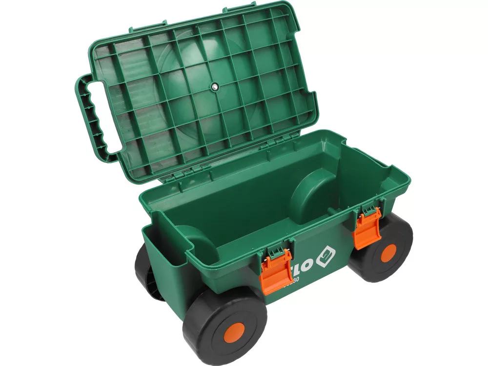Kerti kocsi, tartós műanyaggal, ergonómikus és kényelmes, 360°-ban forgó üléssel, tágas tárolórekesszel.