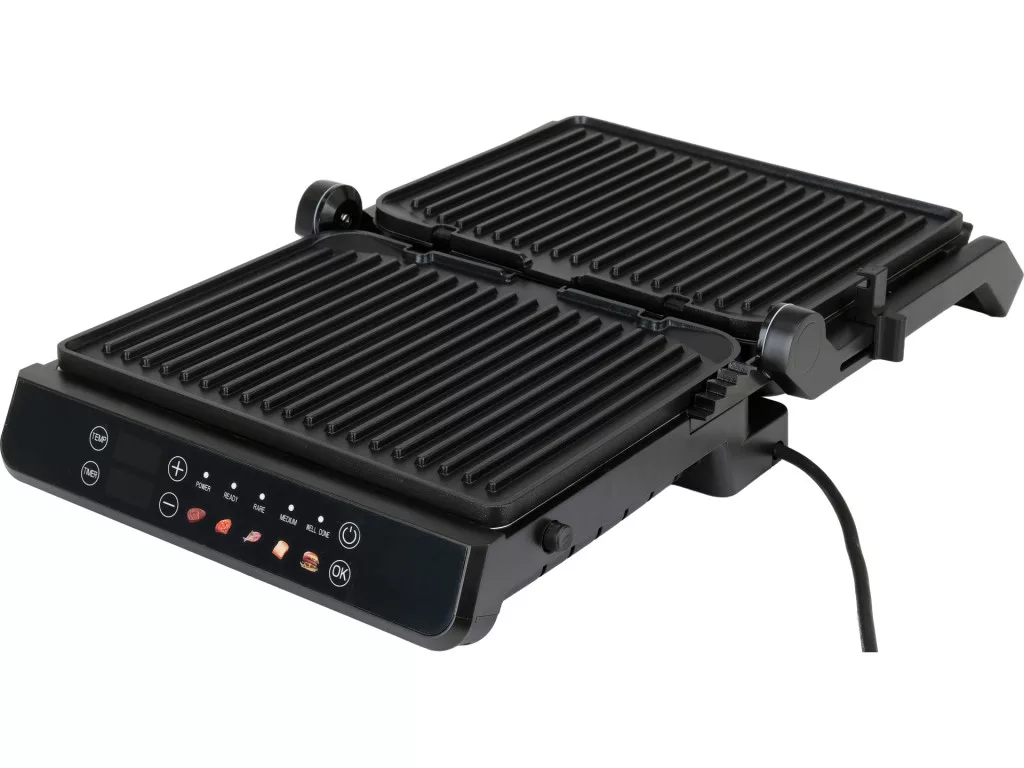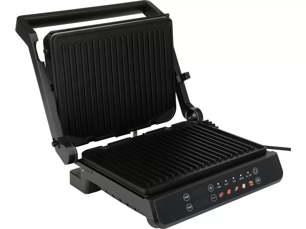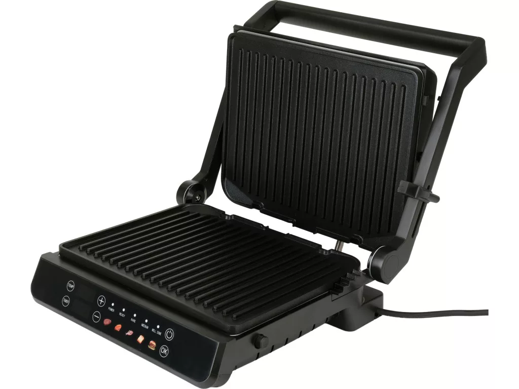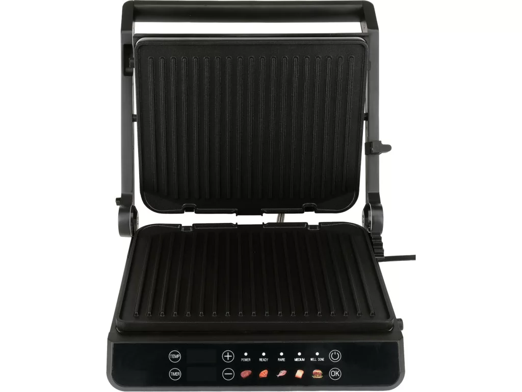 Elektromos grill, 2000 W, 29x23 cm, 140-230°C, tapadásmentes bevonat, 5 automata program + kézi szabályozás, 180°-ban lapra nyitható, LED kijelzős panel, időzítő.