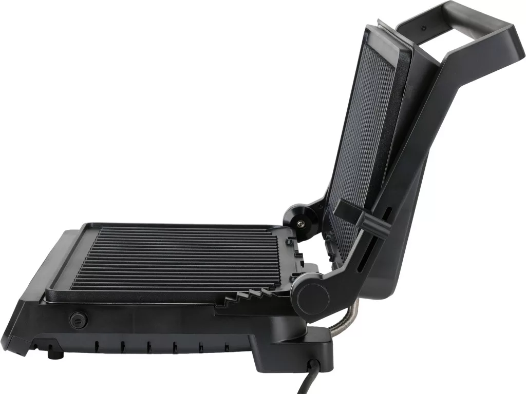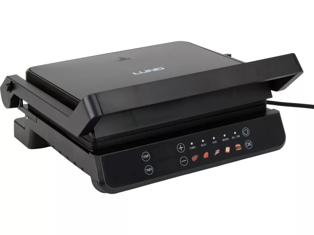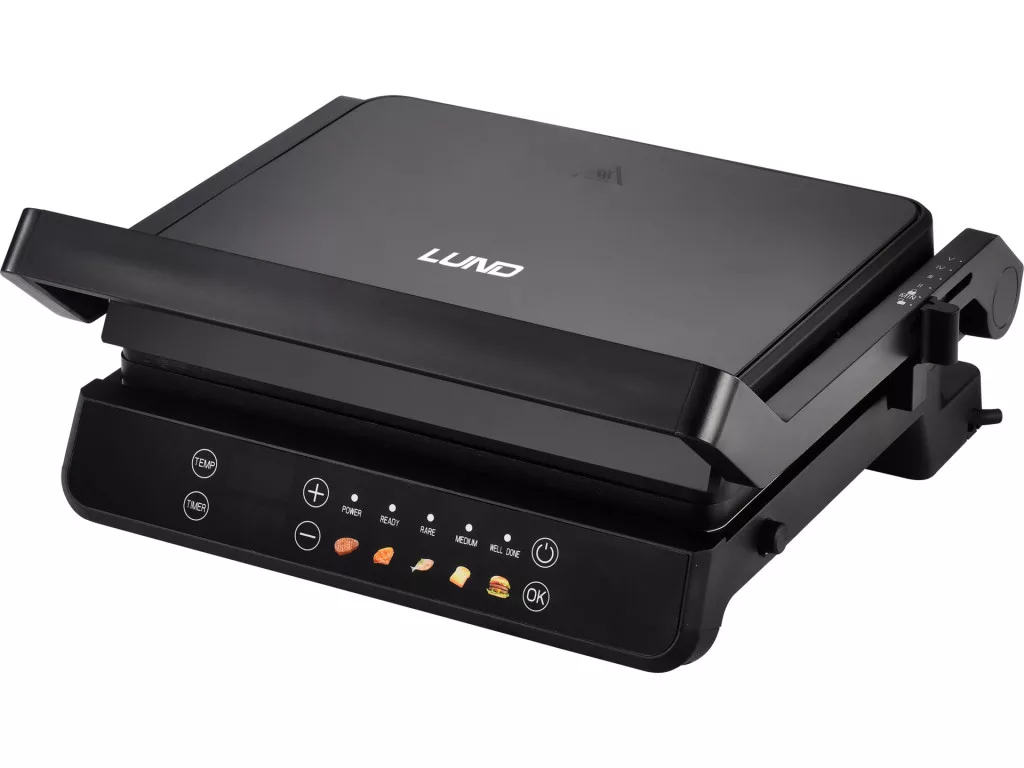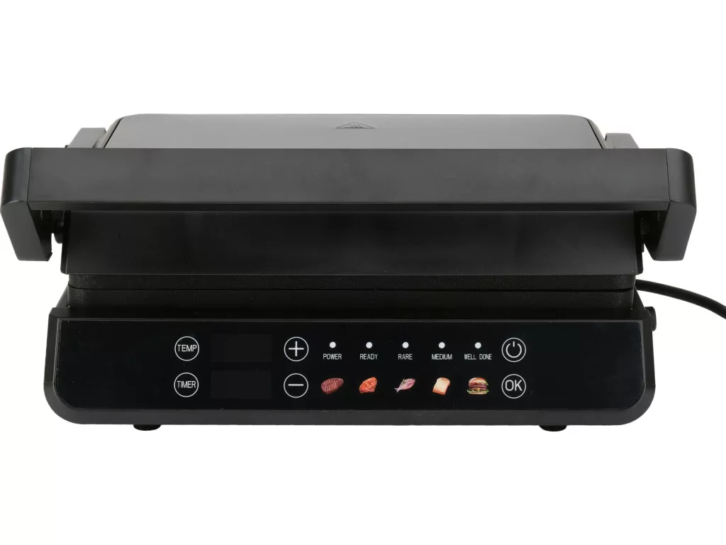 Elektromos grill, 2000 W, 29x23 cm, 140-230°C, tapadásmentes bevonat, 5 automata program + kézi szabályozás, 180°-ban lapra nyitható, LED kijelzős panel, időzítő.