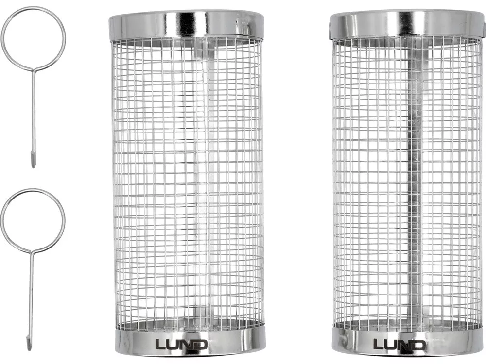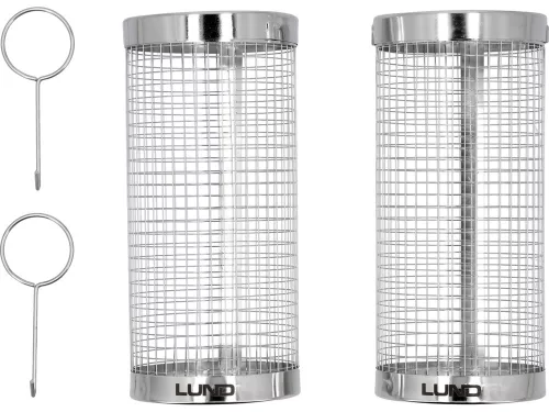 Két darab zárt henger formájú rozsdamentes acél grillkosár, ideális kisebb hozzávalók, szeletelt húsok vagy zöldségek grillezéséhez. A kialakításnak köszönhetően az alapanyagok nem esnek át a rácson, miközben egyenletesen sülnek.