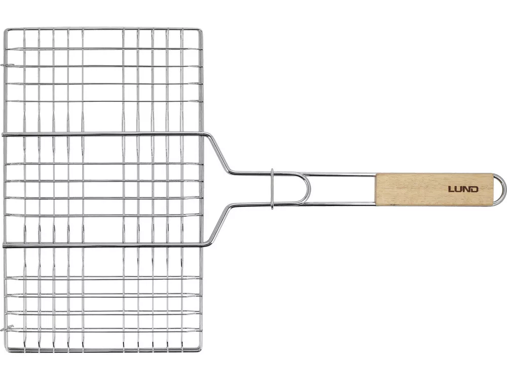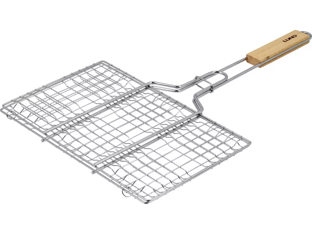 Hordozható, összecsukható grillsütő rács, amely egy helyben tartja az alapanyagokat.