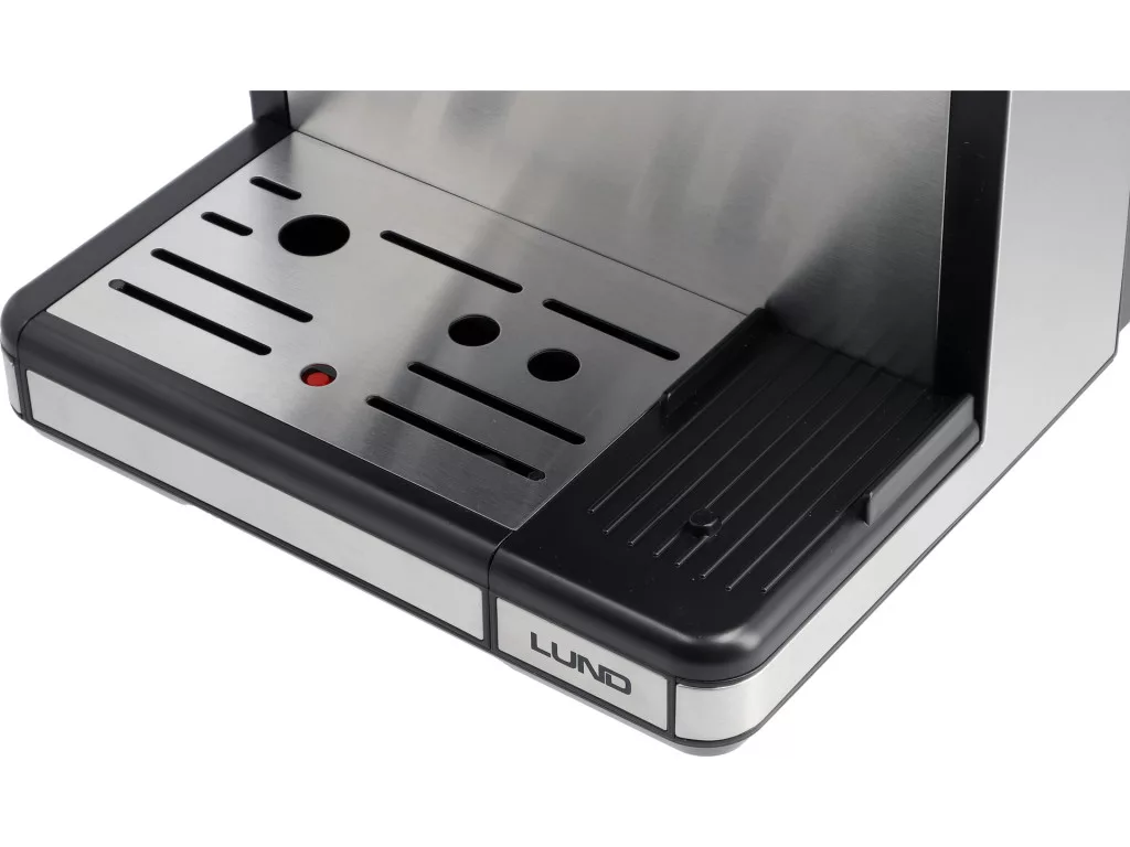 A Lund 68501-es nyomásos kávéfőző acélból készült, modern dizájnnal és funkciókkal ötvözi. 11 automatikus programot kínál, lehetővé téve mind a klasszikus eszpresszó, mind a tejhabos finomságok elkészítését – gyorsan, kényelmesen és mindig ismételhető minőséggel. A színes érintőpanel gyors és intuitív módon teszi lehetővé az ital kiválasztását és a készülék kezelését, a Thermoblock rendszer és a 20 baros szivattyú pedig stabil extrakciót és gyors üzemkészséget garantál. Ezenkívül a kávéfőző automatikus tisztítási programmal és nagy, könnyen tisztítható víz- és tejtartályokkal van ellátva, ami megkönnyíti a mindennapi használatot.