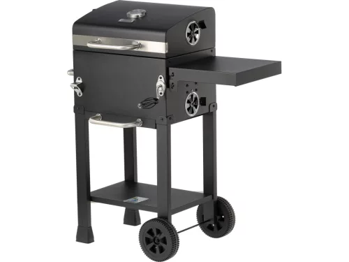 Praktikus hordozható széngrill, stabil felépítés, könnyű kezelés és szabályozható levegőáram a hőmérséklet pontos beállításához; állítható rácsmagasság, zárható fedél, kompakt méret teraszhoz.