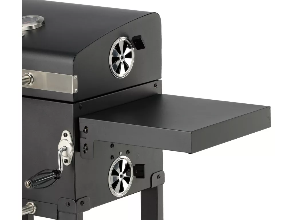 Praktikus polcok és fogantyúk - az összecsukható oldalsó polc munkalapként használható, az alsó polc a szén és edények vagy grill-kiegészítők tárolására szolgál. Az acélból készült fogantyúkkal kényelmesen felakaszthatók a csipesz vagy a lapát, és könnyen kezelhető a grill.