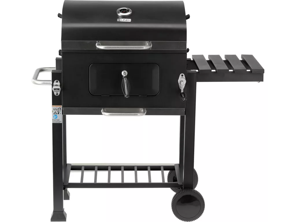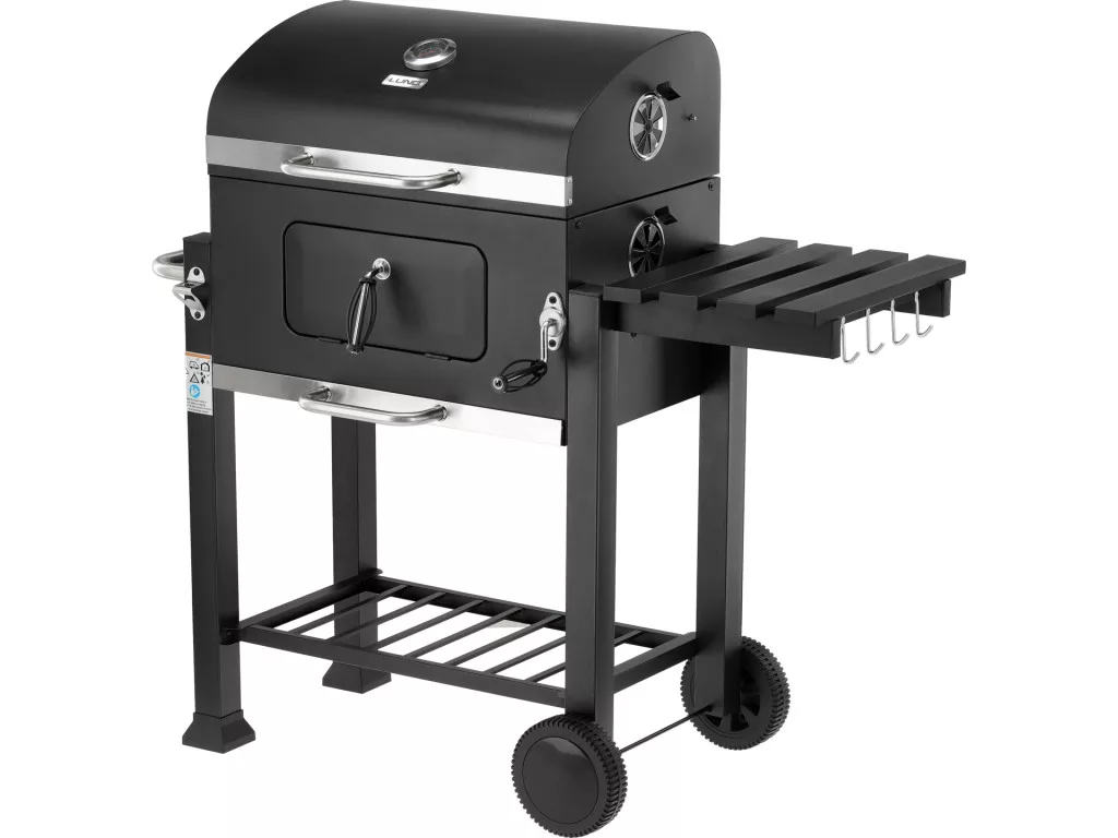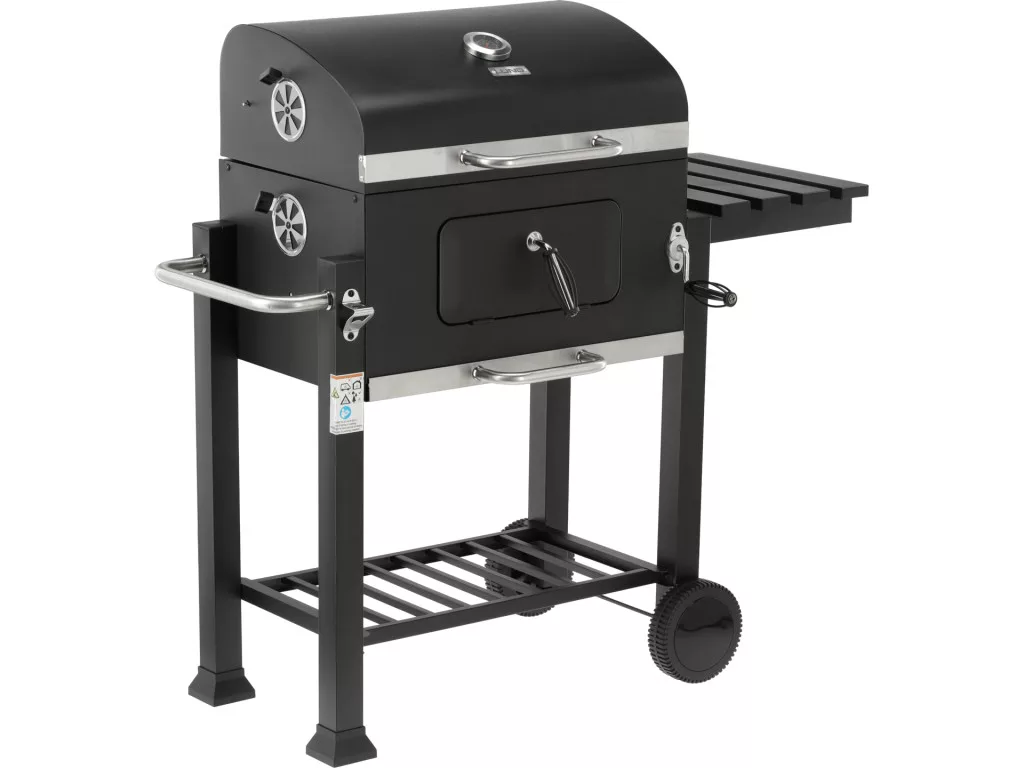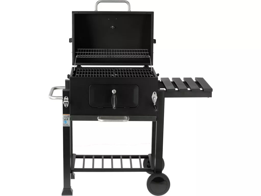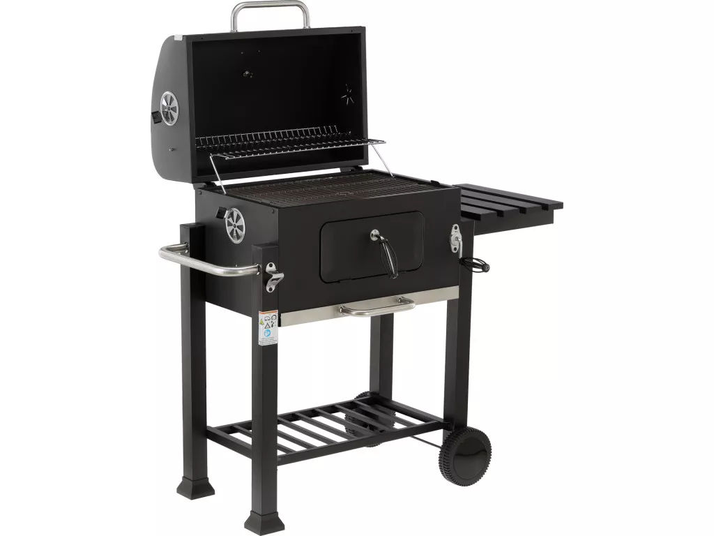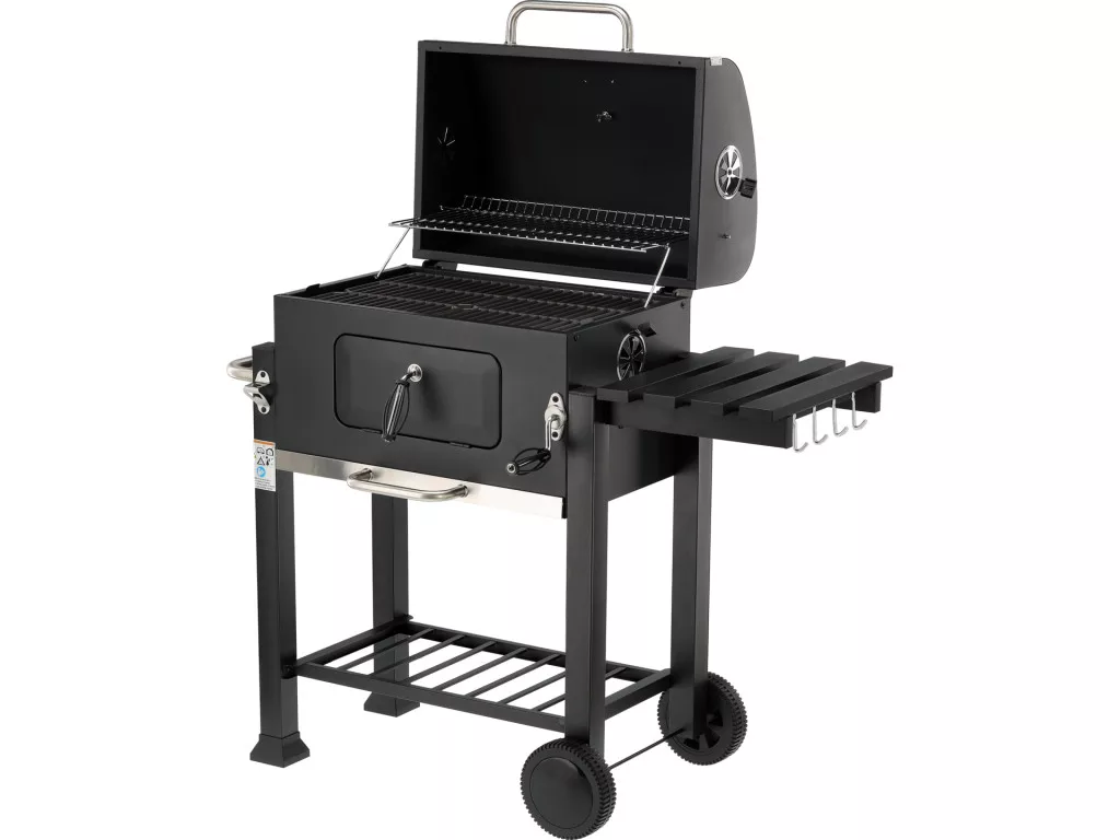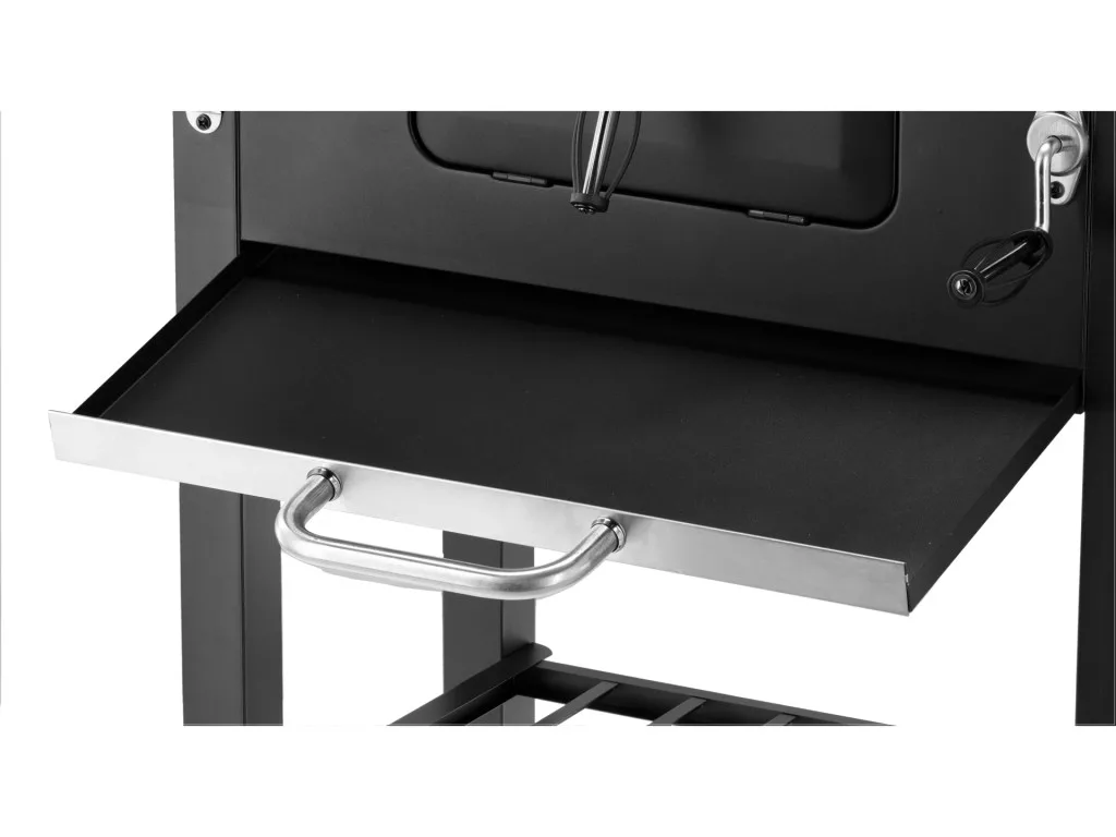 - Praktikus polcok és fogantyúk – a szétnyitható oldalsó polc munkafelületként szolgál, az alsó polc pedig a szenet, edényeket vagy grill-kiegészítőket tárolhatja. Acél fogantyúk kényelmesen lehetővé teszik a fogók vagy a lapát felakasztását és a grill használatát.