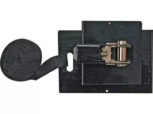 Húzóöv a padlólemezek felszereléséhez. Az 5 m hosszú nejlonszíj mellett a készlet széles fémhorgokat és egy húzó racsnit is tartalmaz. A racsnis mechanizmus határozott nyomást gyakorol az összeillesztendő részekre, pl. a hornyolt élű panelekre.