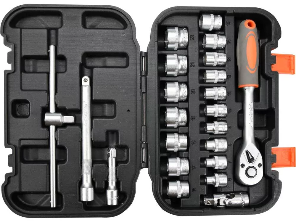 3/8"-os hatszögletű dugókulcs-készlet.. A szerszámok gyártásához minőségi acélokat használnak. A készlet egy kényelmes, funkcionális műanyag tartóval van ellátva