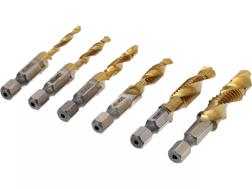 6x menetfúrók HSS 4241 TiN bevonattal, kopás- és hőálló. 1/4" tartó (6,3 mm). Fúróméretek: M3×0,5; M4×0,7; M5×0,8; M6×1; M8×1,25; M10×1,5. Egy ciklusban fúr és menetkészítés acélra, rézre, bronzra és műanyagra.