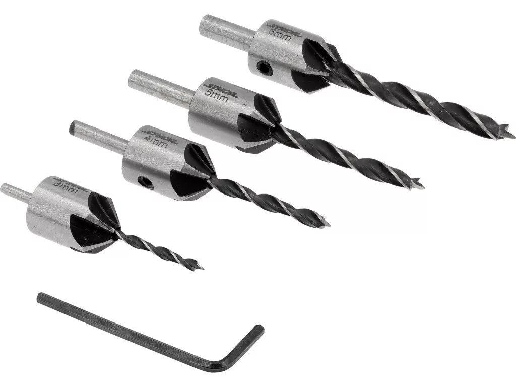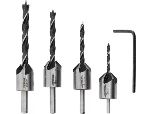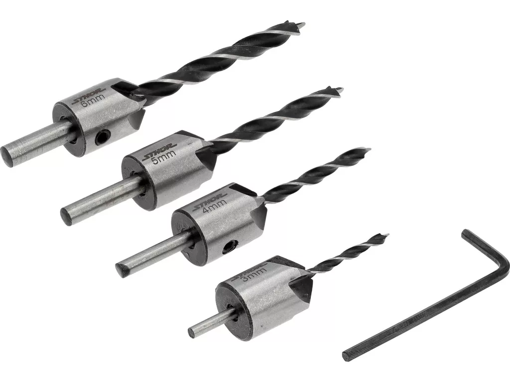 Fa fúrók mélyítő fejjel, HSS 4241 acélból; fekete felületű, hőálló; centráló élgeometria pontosságot ad; 3–6 mm, hossz 60/74/85/92 mm; imbuszkulcs a készletben.