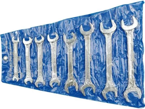 Kétoldalas szénacélból készült villáskulcs készlet 8 részes. A kulcsfejek 15 fokban ferdén állnak